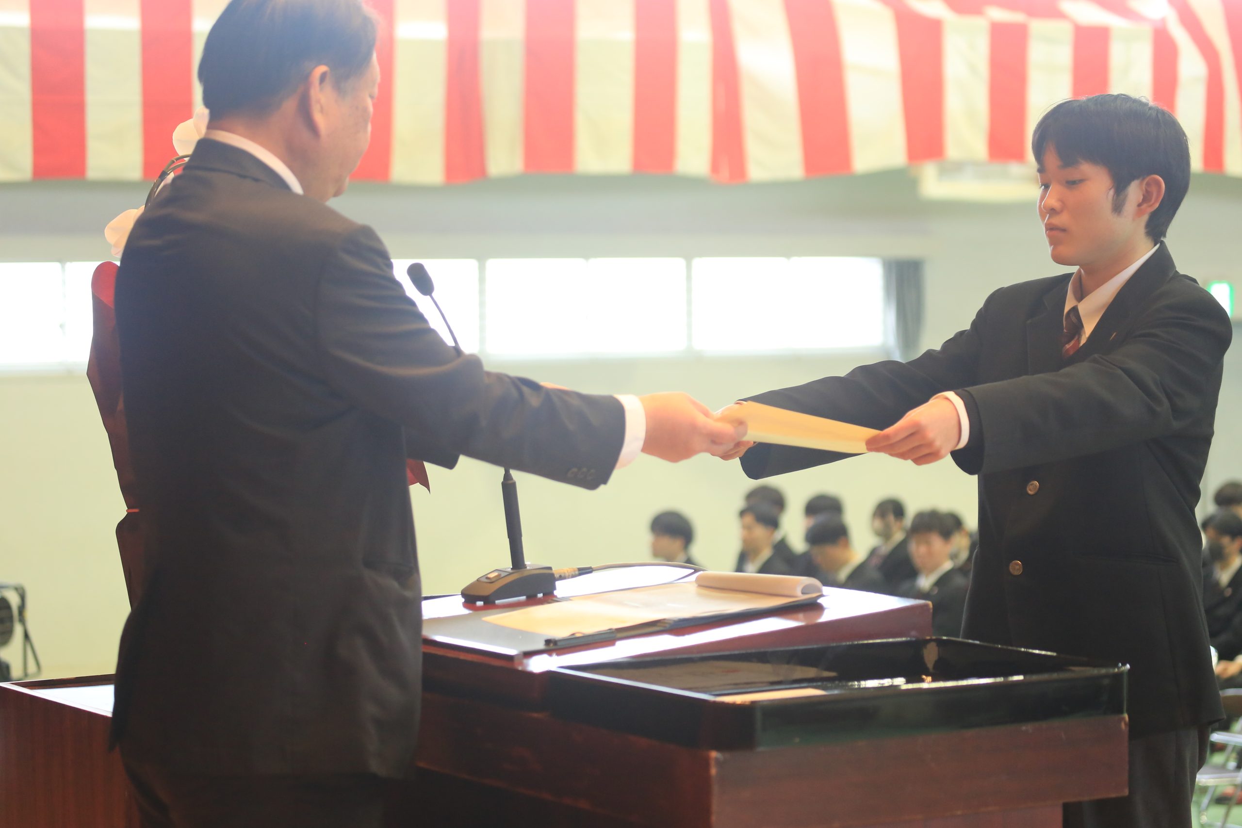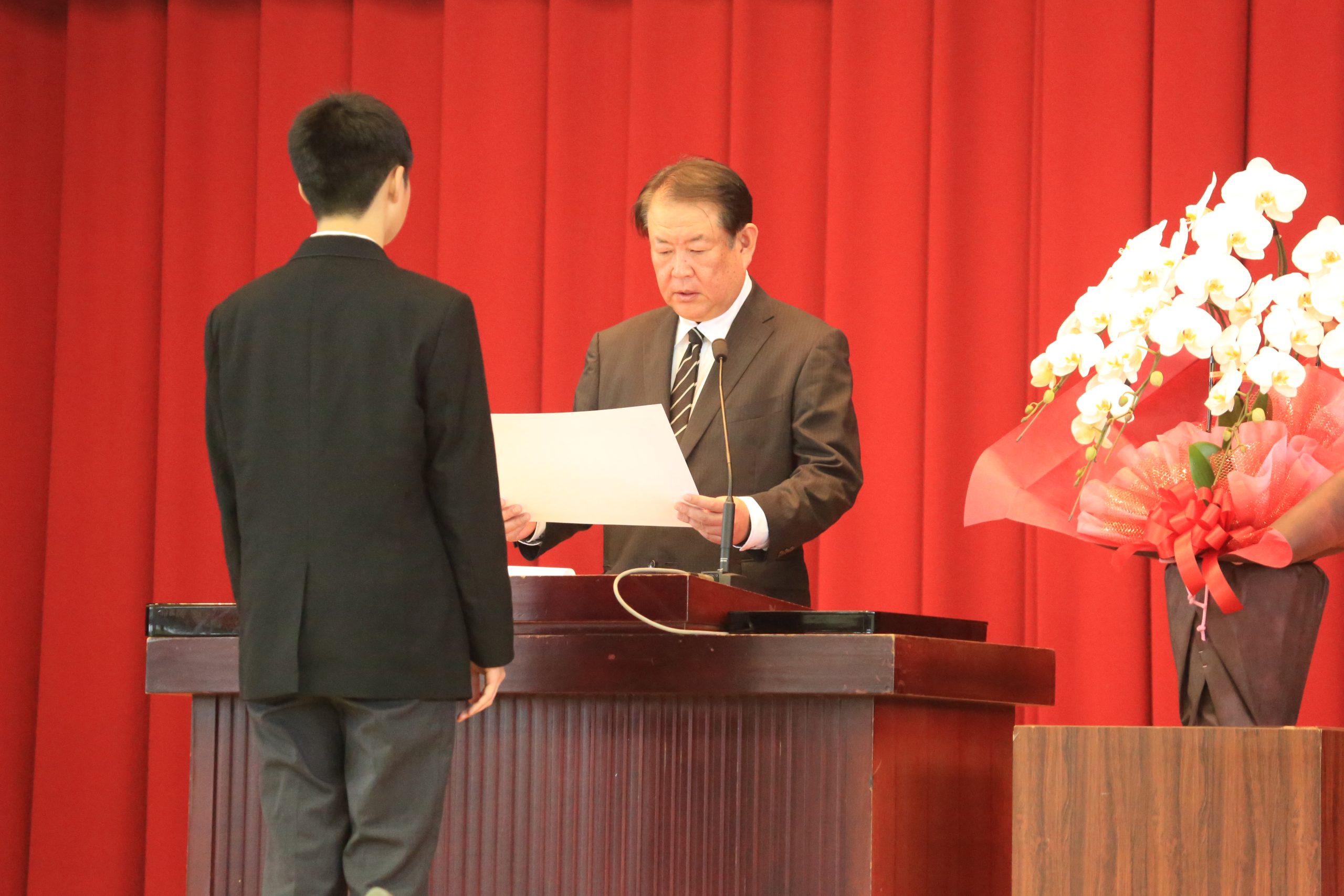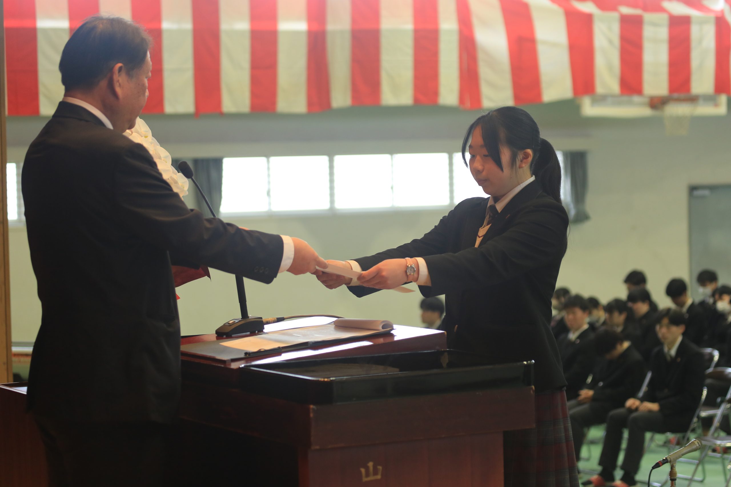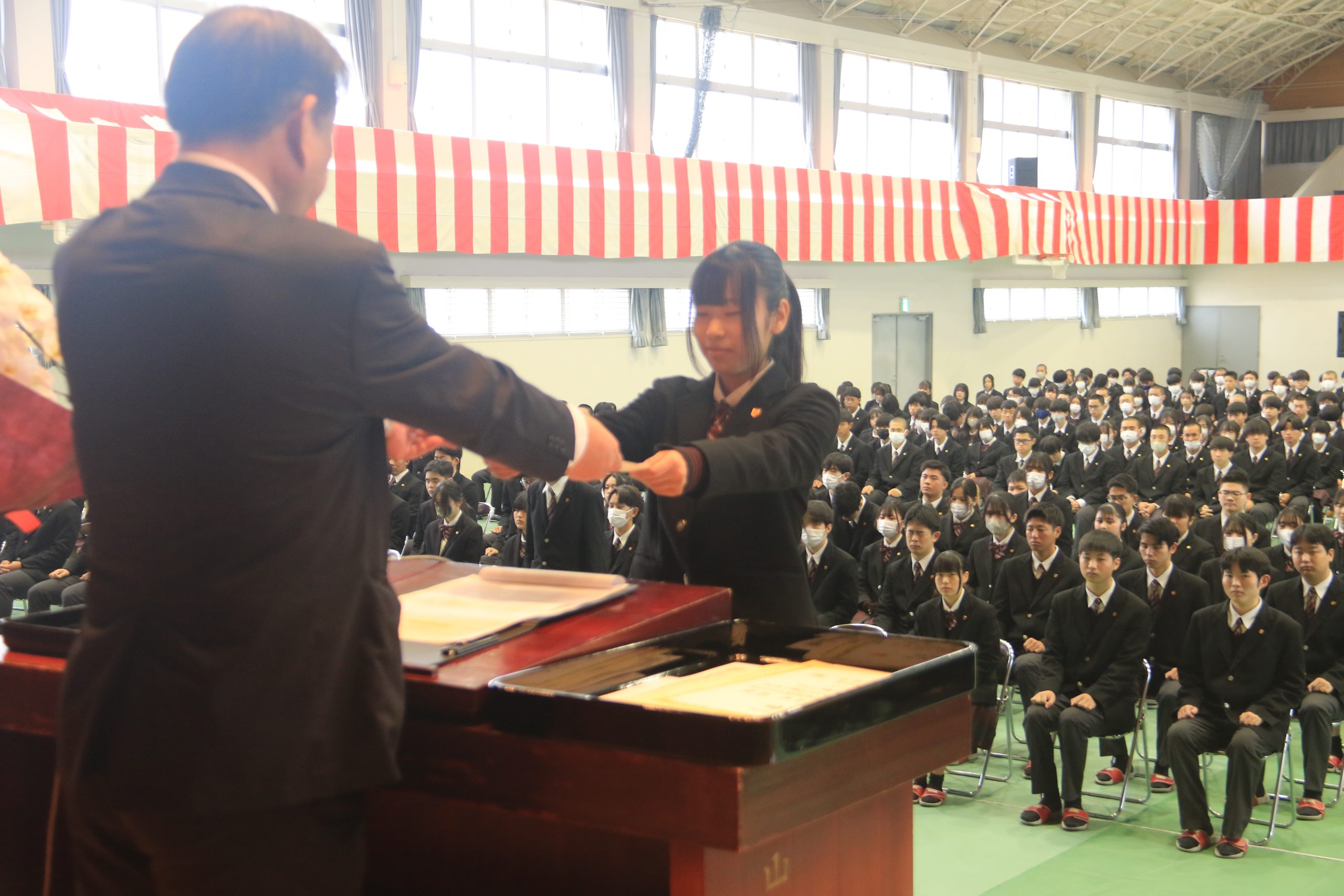 賞状授与式を行い、校内外からの賞状を3年生に授与しました。 写真はその一部です。