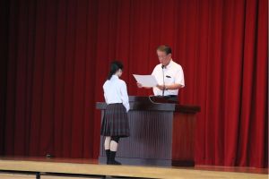 賞状納め式では、1学期に活躍した陸上部、剣道部、野球部、バドミントン部、珠算・電卓部、英会話同好会、スポーツクライミングの賞を披露しました。なお、陸上部、バドミントン部、英会話同好会は全国大会に出場します。