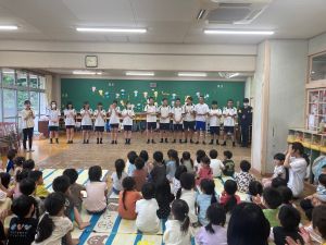 全クラスの園児さんの前で「なぞなぞ」や「じゃんけん列車」などをさせてもらい、園児さんは積極的な発言や参加をしてくれて、生徒はとても感動しておりました。