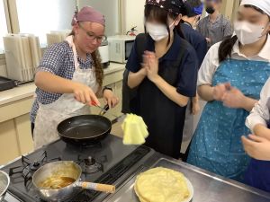 家庭科の授業では調理実習に参加し、本校生徒と協力しながら、みたらし団子とクレープ作りをしました。