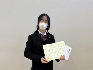 優勝したのは、2年生の田中しずくさん。小学4年生の時に出会った先生から教えていただいた「トライアンドエラー」という言葉を心の支えに日々努力を続けているというスピーチでした。昨年度は悔しい思いをしたスピーチコンテストの舞台でしたが「再挑戦したいと思えるきっかけだ!」と前向きに捉え、今年度も再挑戦。