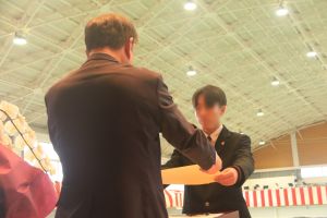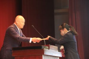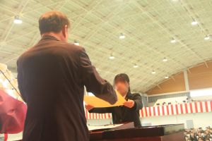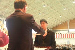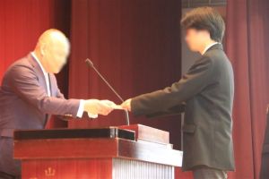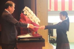 1時間目に同窓会入会式を行い、卒業生の中から代表者が登壇し、同窓会長より委嘱状が渡されました。