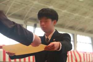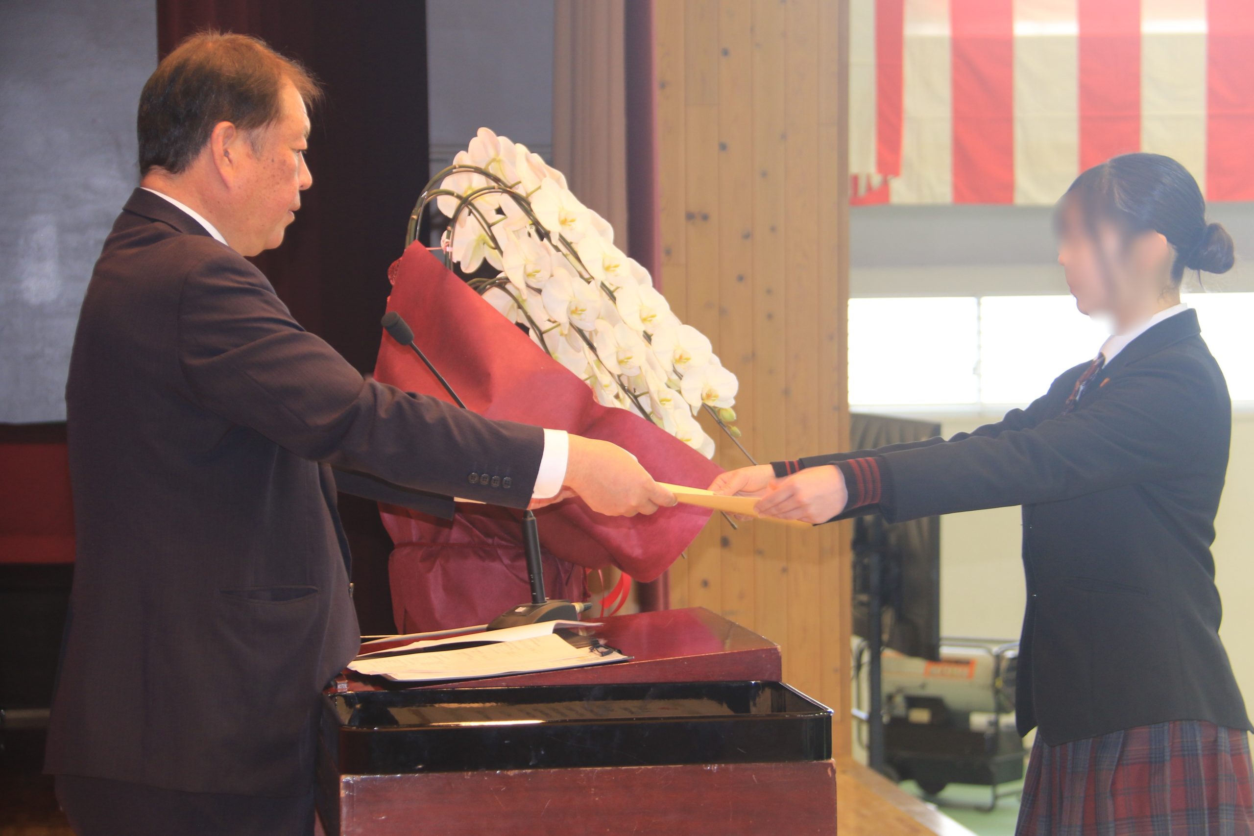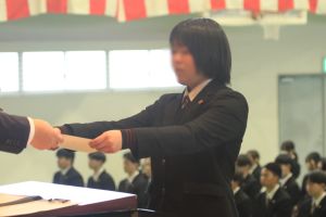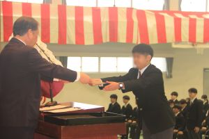 2時間目は全校生徒が体育館に集まり、賞状授与式を行いました。3年生の中から理事長賞や皆勤賞をはじめ校内の規定で努力した者に対して、また、部活動等で顕著な成績を収めた者や団体に対してそれぞれ賞状を授与しました。