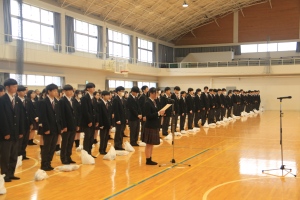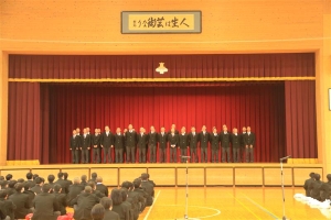 剣道部の周南市スポーツ栄光賞・特色教育振興表彰功績賞、バドミントン部の下松市少年スポーツ賞優秀賞、英会話同好会の特色教育振興表彰功績賞をはじめ、3学期の部活動の結果などを含めた表彰がありました。また、17日(火)に実施したクラスマッチの表彰も行いました。